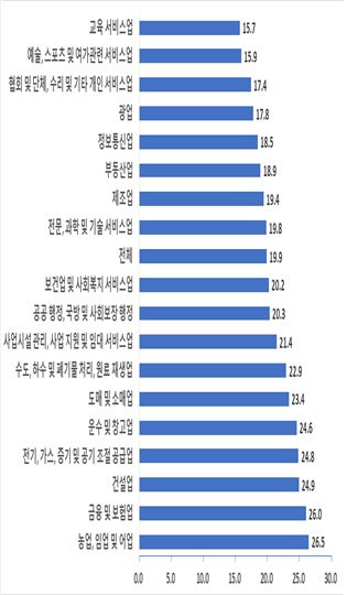 산업별로는 기관수가 5개 미만인 산업을 제외할 경우 금융 및 보험업이 성별 임금격차가 26.0%로 가장 컸고 교육 서비스업이 15.7%로 가장 작았다.