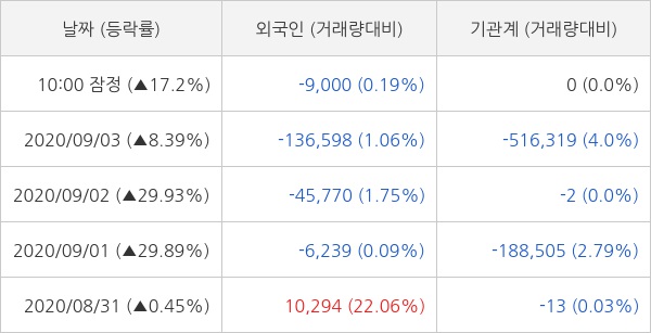 오늘 외국인은 9000주 순매도 하는 것으로 잠정 집계되고 있다. 최근 5일 동안 개인 투자자들은 86만 2147주 순매수 했고, 외국인과 기관은 각각 16만 7953주 순매도, 70만 5548주 순매도 했다.