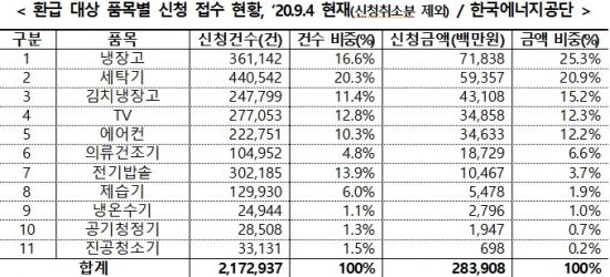 한국에너지공단이 국내 주요 가전제품 제조업체 7개사를 조사한 결과 환급사업을 시행한 5개월간(3월23일~8월22일) 지난해 같은 기간보다 환급 대상 가전제품 매출액이 약 2.2배 증가한 것으로 나타났다.