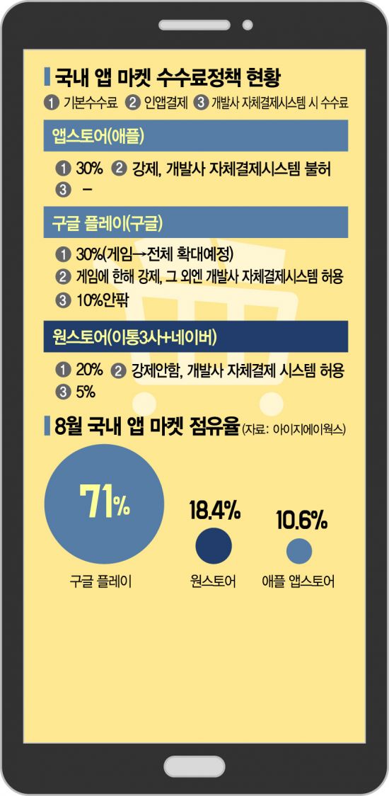 국회와 관계 부처에서는 구글과 애플의 불공정행위에 주목하고 있다. 한준호 더불어민주당 의원은 "(구글은 개발사가) 구글 플레이와 국내 앱마켓에 동시 입점할 경우 구글 첫 페이지 추천(피처드) 노출을 제한해 중소형 게임회사에 암묵적인 제재를 가하고 있다"며 "인앱결제 30% 수수료를 강제적으로 부과한다"고 꼬집었다.