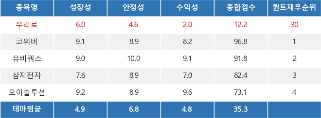 씽크풀 로보알고리즘 RASSI의 분석에 따르면, 우리로의 퀀트 재무 점수는 12.18점으로 5G(5세대 이동통신) 관련 테마 내에서 퀀트 재무 순위 30위에 그쳤다. 이는 우리로는 상대적으로 재무적 측면에서 투자 매력도가 그다지 높지 않다는 것으로 해석될 수 있다. 반면에 코위버는 다른 종목 평균 대비 높은 성장성과 안정성, 수익성 점수로 퀀트 재무 순위 1위를 차지했다.