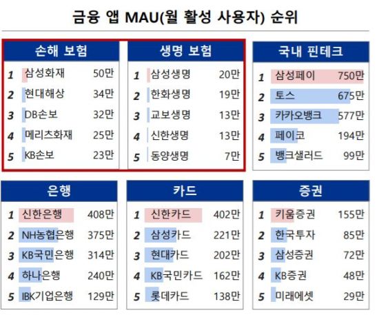 다른 금융업권 앱 이용은 보험업계보다 활성화됐다. 은행권에서는 신한은행(408만)·NH농협은행(375만)·KB국민은행(314만)·하나은행(240만)·IBK기업은행(129만) 등이, 카드업계에서는 신한카드(402만)·삼성카드(221만)·현대카드(202만)·KB국민카드(162만)·롯데카드(138만) 등이 100만명 넘는 활성 사용자를 보유하고 있었다. 핀테크업체의 경우 삼성페이(750만), 토스(675만), 카카오뱅크(577만), 페이코(194만), 뱅크샐러드(99만) 등이 상위권을 차지했다.
