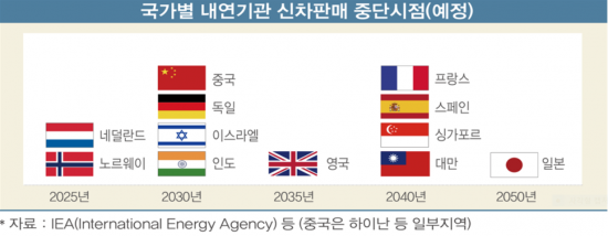 자동차 배출 이산화탄소를 줄이기 위해 각국 정부들은 내연기관 자동차 규제를 강화하는 한편 전기차 수요도 늘고 있다. 국제에너지기구(IEA) 등에 따르면 네덜란드, 노르웨이는 2025년 내연기관 신차판매를 중단한다. 글로벌 전기차 판매량이 2030년대 후반이면 내연기관차를 넘어설 전망이다.