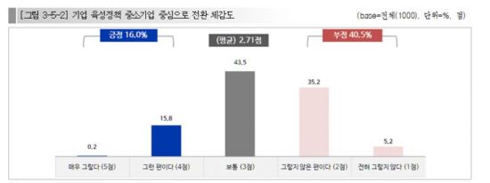 현 정부의 기업 육성정책의 방향이 대기업에서 중소기업 중심으로 전환되고 있다고 느끼는지를 질문한 결과, ‘그렇다’는 긍정 응답(16.0%) 보다는 ‘그렇지 않다’는 부정 응답(40.5%)이 더 높은 것으로 나타났다.