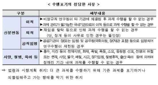 하지만 A교수는 2년반만에 연구를 포기했다. R&D 수행 중에 보건복지부가 10년간 2000억원을 투입하는 '백신실용화기술개발사업'에 공모에 신청했고 사업단장으로 임명됐기 때문이다. 이에 대해 과기정통부와 한국연구재단은 특별한 제재 없이 A교수의 연구 수행 포기를 받아들였다.