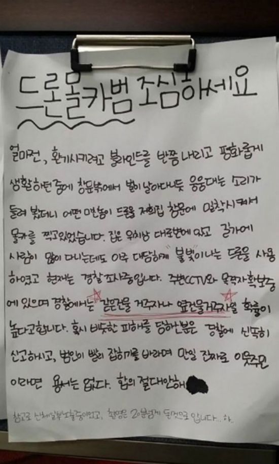'드론 몰카' 범죄는 이번이 처음이 아니다. 지난 2017년 6월 대전 중구에 사는 한 여성은 자신이 사는 오피스텔 승강기에 "창문 밖에서 벌이 날아다니듯 윙윙대는 소리가 들려 봤더니, 누군가 드론을 우리 집 창문에 밀착시켜 몰카를 찍고 있었다"며 경고문을 썼고 누군가 이를 트위터에 올리면서 경찰이 수사에 착수하기도 했다.