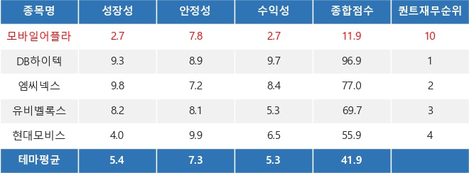 씽크풀 로보알고리즘 RASSI의 분석에 따르면, 모바일어플라이언스의 퀀트 재무 점수는 11.86점으로 스마트카(SMART CAR) 관련 테마 내에서 퀀트 재무 순위 10위에 그쳤다. 이는 모바일어플라이언스는 상대적으로 재무적 측면에서 투자 매력도가 그다지 높지 않다는 것으로 해석될 수 있다. 반면에 DB하이텍은 다른 종목 평균 대비 높은 성장성과 안정성, 수익성 점수로 퀀트 재무 순위 1위를 차지했다.