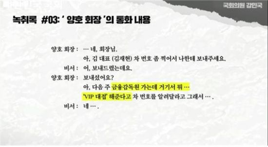 이날 공개된 또 다른 녹취록에서 양 회장은 김재현 대표 비서에게 “차 번호 좀 찍어서 나에게 보내달라. 다음주 금융감독원 가는데 거기서 'VIP 대접' 해준다고 차 번호를 알려달라 그래서...”라고 말했다.