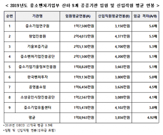 국회 산업통상자원중소벤처기업위원회 소속 이주환 국민의힘 의원이 23일 중소벤처기업부 산하 9개 공공기관으로부터 제출받은 ‘2019년도 임원 및 신입직원 평균 연봉 현황’에 따르면 신입직원 평균 연봉은 약 3856만원 수준인 반면 임원 평균 연봉은 1억8963만원으로 평균 4.9배 이상인 것으로 나타났다.