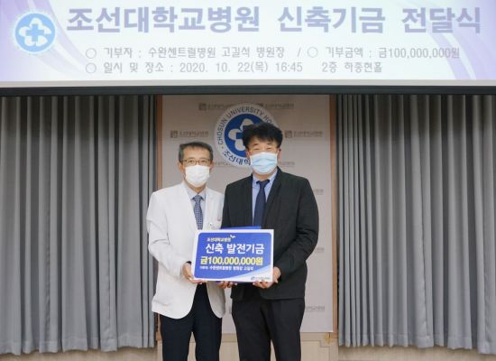 [아시아경제 호남취재본부 윤자민 기자] 조선대학교병원은 고길석 수완센트럴병원 대표원장(조선의대 24회 졸업)이 최근 병원 신축을 위한 발전기금 1억 원을 기탁했다.