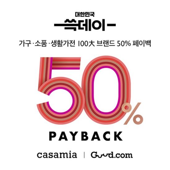 먼저 굳닷컴 입점 100대 브랜드와 까사미아의 온라인 전용 브랜드 ‘어니언’의 50% 페이백 행사를 진행한다. 행사 기간 내 브랜드의 가구 및 소품, 가전 구매 시 결제 금액의 50%를 마일리지로 돌려받을 수 있다. 페이백 대상 상품은 행사 기간 동안 매일 변경되며, 돌려받은 마일리지는 연말까지 굳닷컴에서 현금처럼 사용 가능하다.