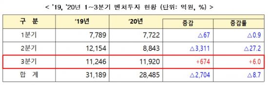 [아시아경제 김철현 기자] 올해 신종 코로나바이러스감염증(코로나19)으로 타격을 입었던 벤처투자 실적이 3분기에 지난해 대비 증가세로 돌아섰다. 3분기까지 누적 실적의 전년 대비 감소율은 상반기보다 크게 줄었다. 벤처펀드 결성액도 늘면서 누적 수치는 증가세로 전환됐다. 코로나19 위기 지속에도 불구하고 위축됐던 벤처투자 시장의 회복세가 뚜렷해지고 있는 것이다.