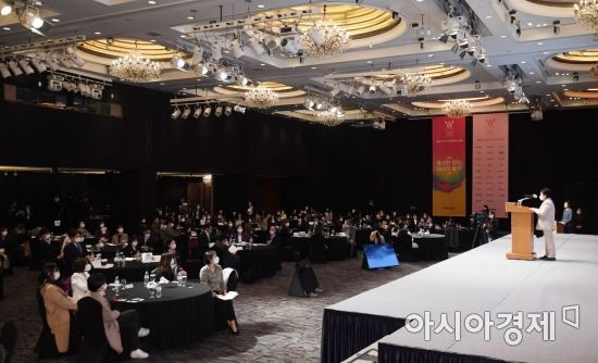 28일 서울 중구 롯데호텔에서 아시아경제 주최로 열린 '2020 아시아여성리더스포럼'에서 정춘숙 국회 여성가족위원회 위원장이 축사를 하고 있다./김현민 기자 kimhyun81@