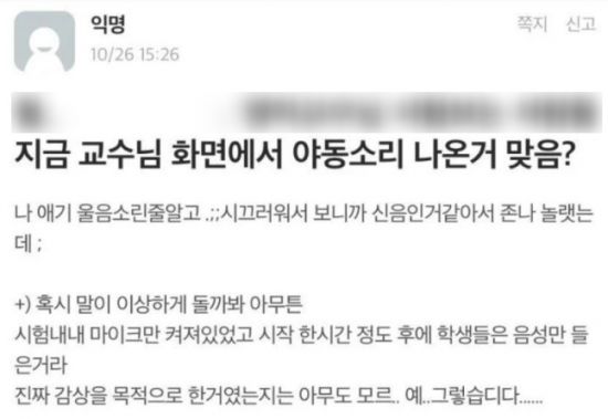 당시 A 교수의 카메라는 꺼진 상태였으나 마이크가 켜져 있어 시험을 본 학생들은 교수가 재생한 것으로 보이는 소리를 들은 것으로 파악됐다.