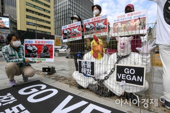 9일 서울 종로구 광화문 광장에서 비건 세상을 위한 시민모임 및 한국채식연합 등 관계자들이 완전한 채식을 촉구하는 퍼포먼스를 펼치고 있다./강진형 기자aymsdream@