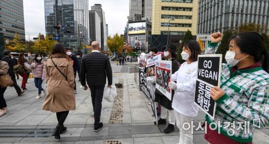 9일 서울 종로구 광화문 광장에서 비건 세상을 위한 시민모임 및 한국채식연합 등 관계자들이 완전한 채식을 촉구하는 퍼포먼스를 펼치고 있다./강진형 기자aymsdream@