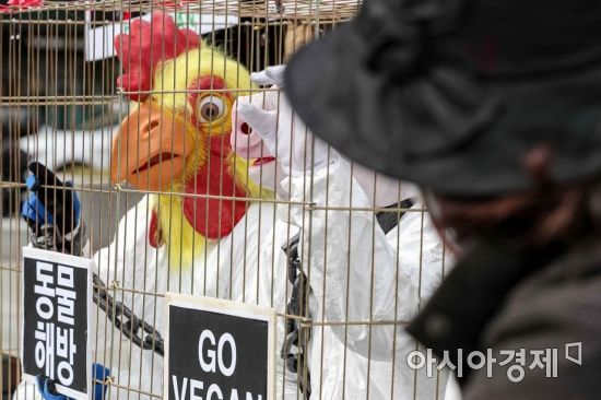 9일 서울 종로구 광화문 광장에서 비건 세상을 위한 시민모임 및 한국채식연합 등 관계자들이 완전한 채식을 촉구하는 퍼포먼스를 펼치고 있다./강진형 기자aymsdream@