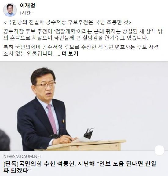 이 지사는 이날 아시아경제가 보도한 '국민의힘 추천 석동현, 지난해 "안보 도움 된다면 친일파 되겠다"'는 제목의 기사를 링크하고 "석동현 변호사는 후보 자격조차 없는 인물"이라고 비판했다.