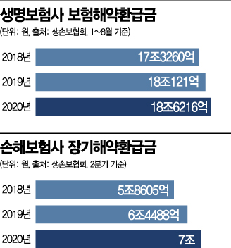손해보험업계도 상황은 비슷하다. 손해보험협회에 따르면 올 6월까지 주요 국내 손보사가 지급한 장기해약환급금은 7조원으로 전년대비 8.55%(5512억원) 늘어났다. 장기해약환급금은 가입자의 장기보험 상품 해약에 따라 보험사가 지급하는 비용을 말한다.