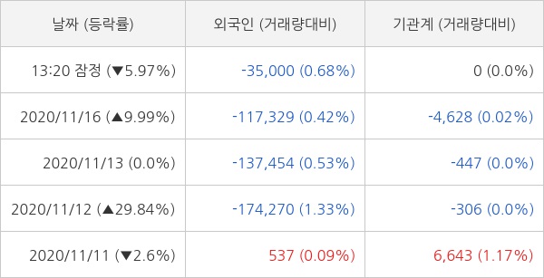 오늘 외국인은 3만 5000주 순매도 하는 것으로 잠정 집계되고 있다. 최근 5일 동안 개인 투자자들은 48만 1933주 순매수 했고, 외국인과 기관은 각각 42만 5936주 순매도, 582주 순매수 했다.