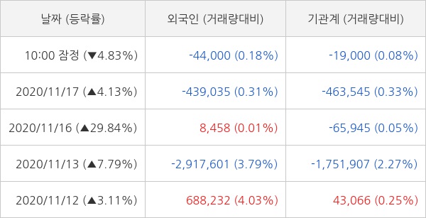 오늘 외국인은 아시아나항공을 4만 4000주 순매도 하고 기관은 1만 9000주 순매도 하는 것으로 잠정 집계되고 있다. 최근 5일 동안 개인 투자자들은 108만 4495주 순매수 했고, 외국인과 기관은 각각 88만 7821주 순매도, 17만 8503주 순매수 했다.