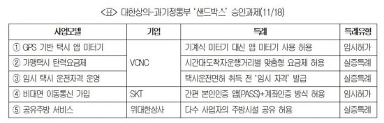 대한상공회의소 샌드박스지원센터와 과학기술정보통신부는 18일 ‘ICT 샌드박스 심의위원회’를 서면으로 열고, GPS 기반 택시 앱 미터기 임시허가, 가맹택시 탄력요금제 실증특례, 임시 택시 운전자격 운영 실증특례, 비대면 이동통신 가입 임시허가, 공유주방 서비스 실증특례 등 5건을 승인했다고 밝혔다.