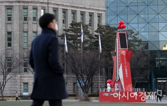 1일 서울시청 앞 광장에 사랑의 온도탑이 설치돼 있다. 사랑의열매 사회복지공동모금회는 오늘부터 내년 1월 31일까지 연말연시 이웃돕기 캠페인 '희망 2021 나눔 캠페인'을 진행한다. /문호남 기자 munonam@