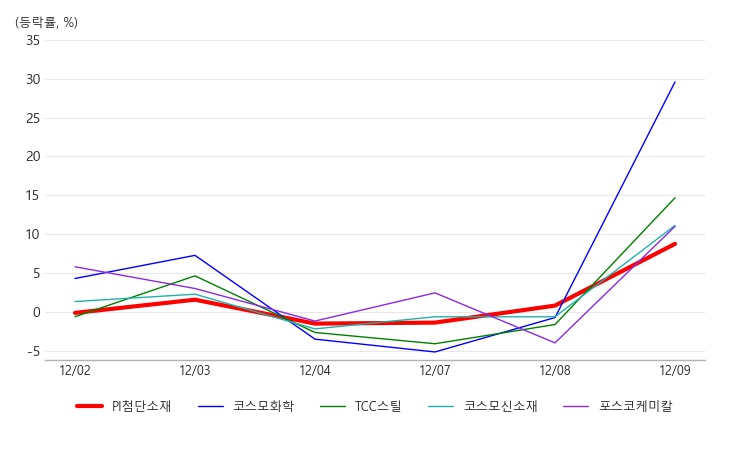 09일 2차전지(소재/부품) 테마가 전일 대비 3.07% 상승하면서 강세를 보이는 가운데 관련주로 주목받고 있는 PI첨단소재가 전일 대비 8.58% 상승하며 급등하고 있다. PI첨단소재는 PI필름 및 관련 가공제품 제조, 판매업체로 알려져 있다.