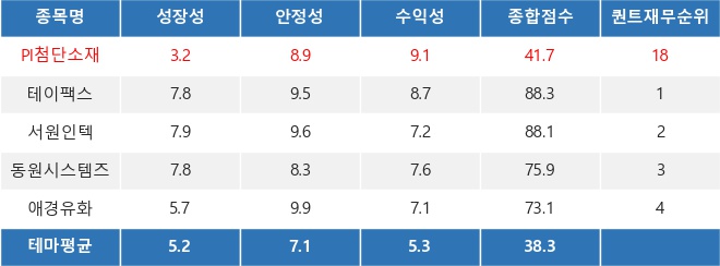 씽크풀 로보알고리즘 RASSI의 분석에 따르면, PI첨단소재의 퀀트 재무 점수는 41.66점으로 2차전지(소재/부품) 관련 다른 종목 평균 보다 안정성과 수익성 점수가 높아, 테마 내에서 18위를 차지했다. 이는 재무적인 측면에서 PI첨단소재의 대내외 경제환경 변화에 대한 대응 능력과 효율적인 수익창출 능력이 테마 내 다른 종목에 비해 양호함을 알 수 있다.