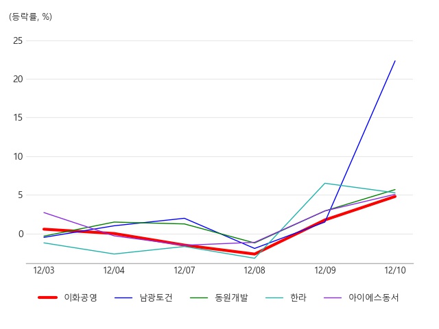 10일 건설 중소형 테마가 전일 대비 3.45% 상승하면서 강세를 보이는 가운데 관련주로 주목받고 있는 이화공영이 전일 대비 5.17% 상승하며 급등하고 있다. 이화공영은 건축공사 위주의 중견 건설업체로 알려져 있다.