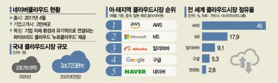 [아시아경제 부애리 기자] 네이버가 아마존웹서비스(AWS), 마이크로소프트(MS) 등 글로벌 기업들의 전유물로 여겨졌던 클라우드 시장에 본격적인 도전장을 던졌다. 국내 포털 1위 자리를 지켜온 네이버가 이번엔 클라우드 1위 자리를 차지하겠다는 포부다. 여기에는 ICT 산업의 근간이 되는 클라우드 사업이 해외업체들에게 종속될 경우 국내 생태계가 흔들릴 수 있다는 위기감이 바탕이 됐다. 네이버는 클라우드를 신성장동력으로 삼고 해외진출 등 사업 확장에도 박차를 가하고 있다.
