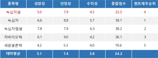 씽크풀 로보알고리즘 RASSI의 분석에 따르면, 녹십자셀의 퀀트 재무 점수는 23.5점으로 제대혈 관련 다른 종목 평균 보다 안정성과 수익성 점수가 높지만, 퀀트 재무 순위는 4위(총 7종목)에 그쳤다. 반면에 녹십자는 다른 종목 평균 대비 높은 성장성과 안정성, 수익성 점수로 퀀트 재무 순위 1위를 차지했다.
