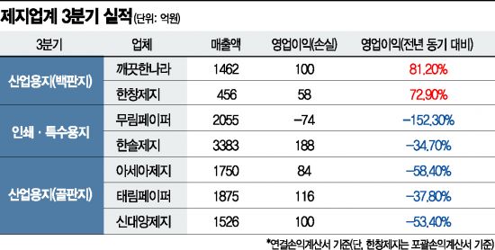 국내 제지 1위 업체인 한솔제지는 백판지 분야에서는 호실적을 거뒀지만, 제지사업부의 70%에 달하는 인쇄ㆍ특수지의 부진으로 3분기 매출은 전년대비 하락했다. 인쇄용지가 주류인 무림페이퍼도 3분기 어닝쇼크를 기록했다.