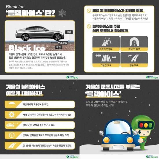 [아시아경제 이관주 기자] 도로교통공단은 겨울철 '도로 위 암살자'로 불리는 블랙아이스(black ice) 현상에 대비하는 방법을 안내하는 카드뉴스를 제작했다고 25일 밝혔다.
