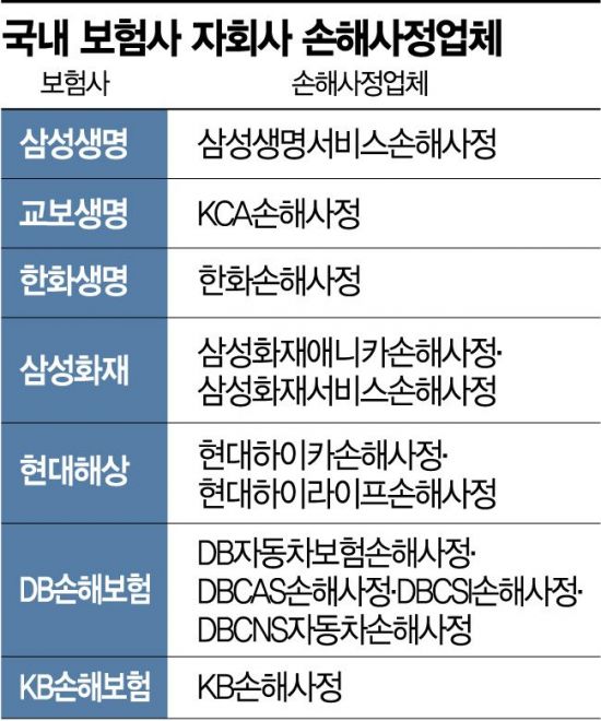 또 손해보험 3개사(삼성화재·현대해상·DB손해보험)는 전체 3480억 원의 76.4%에 해당하는 2660억원을 자회사에 지급했다. 이들 6곳이 손해사정 업무 대부분을 위탁하고 있는 11개 손해사정업체는 모두 보험사가 지분을 100% 소유하고 있다.