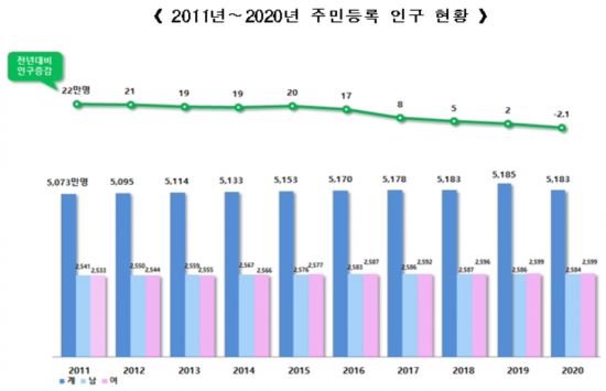 3일 행정안전부가 발표한 주민등록 인구통계에 따르면, 2020년 12월31일 기준 우리나라 주민등록인구는 5182만9023명으로 집계됐다. 이는 2019년 말 기준 5184만9861명보다 0.04%(2만838명)이 줄어 든 규모로, 정부가 주민등록 인구통계를 공표하기 시작한 2008년 이후 처음으로 감소세로 돌아섰다.