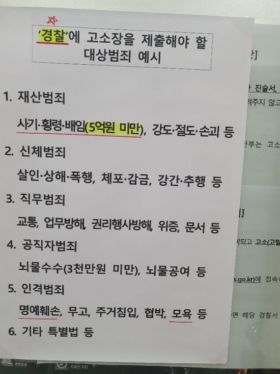 안내문에는 재산범죄 중 ‘5억원 미만’의 사기·횡령·배임, 공직자범죄 중 ‘3천만원 미만’의 뇌물수수 등 민원인들이 혼동하기 쉬운 죄명의 구체적인 금액까지 기재됐고, 형광펜과 붉은색 펜까지 동원됐다.