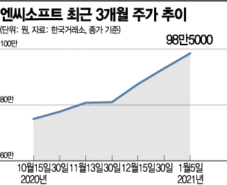 6일 한국거래소에 따르면 전날 엔씨소프트 주가는 전 거래일 대비 0.72%(7000원) 오른 98만5000원에 장을 마감하며 100만원 돌파를 목전에 두게 됐다. 엔씨소프트 주가는 최근 9거래일 연속 상승 마감하며 14.1% 올라 같은 기간 코스피 수익률(7.9%)을 상회했다. 이 기간 코스피시장에서 기관 투자자들이 가장 많이 사들인 종목도 엔씨소프트였다. 기관은 최근 9거래일 간 엔씨소프트의 주식을 941억원어치 순매수했다.