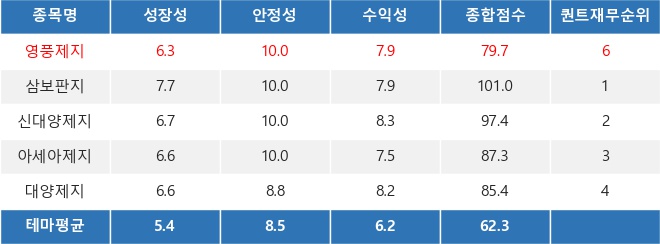 씽크풀 로보알고리즘 RASSI의 분석에 따르면, 영풍제지는 성장성, 안정성, 수익성 모두 테마의 평균 점수를 상회하면서 퀀트 재무 순위 6위(총 12종목)를 차지했다. 이는 재무적인 측면에서 테마 내 다른 종목들에 비해 영풍제지의 투자 매력도가 높은 편이라고 해석될 수 있다.