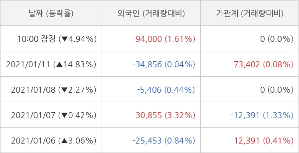 오늘 외국인은 9만 4000주 순매수 하는 것으로 잠정 집계되고 있다. 최근 5일 동안 개인 투자자들은 14만 2532주 순매수 했고, 외국인과 기관은 각각 14만 4191주 순매도, 7만 3402주 순매수 했다.
