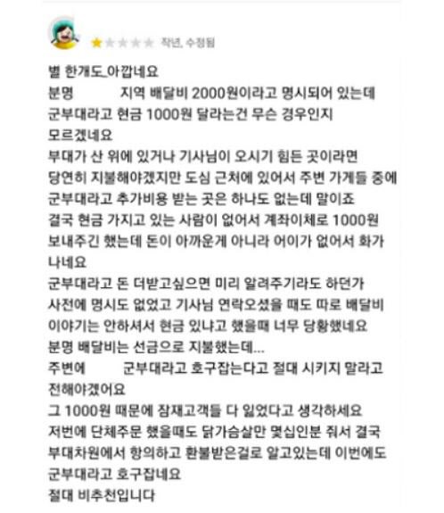 해당 병사는 배달 앱을 통해 치킨을 주문한 뒤 벌점 테러 리뷰를 남겼다. 그는 "업체 측이 추가 배달료 1000원을 요구했다. 지역 배달비 2000원이라고 돼 있는데 군부대라고 현금 1000원을 달라는 것은 무슨 경우인지 모르겠다"며 "주변에 절대 시키지 말라고 전하겠다. 1000원 때문에 잠재고객들 다 잃었다고 생각하라"는 내용의 후기를 올렸다.