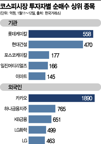 순매도 행진 속에서도 이들이 순매수한 종목이 눈에 띈다. 지난 11~12일 코스피시장에서 기관투자가들이 가장 많이 사들인 종목은 롯데케미칼(558억원)이었다. 이어 현대건설(470억원), 포스코케미칼(177억원), 일진머티리얼즈(166억원), 이마트(145억원) 등 순이었다.