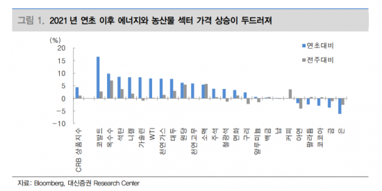 김소현 대신증권 연구원은 "에너지와 농산물 가격이 상승한 요인으로 날씨를 꼽을 수 있다"며 "라니냐(LaNina) 지속으로 유럽과 아시아 지역에서는 추운 겨울이 나타나 난방용 수요가 증가했다"고 설명했다.