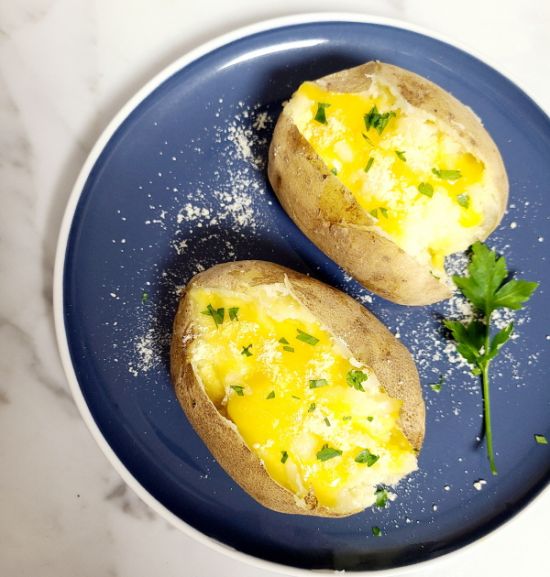 포슬포슬한 감자에 흰색 크림과 치즈가 듬뿍 올려진 감자,