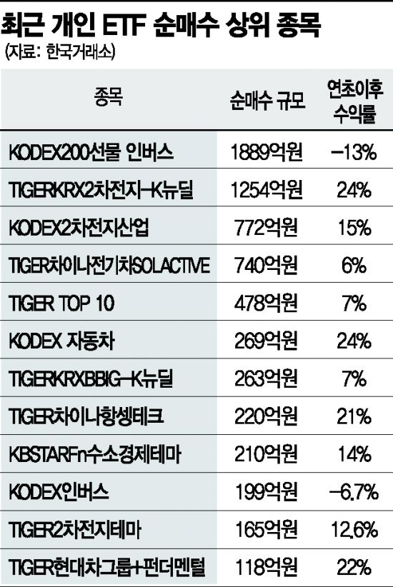 25일 한국거래소에 따르면 최근 10거래일간 개인투자자들이 사들인 ETF 상위 10개 중 7개가 자동차와 2차전지 관련된 것으로 나타났다. 코스피 하락에 베팅하는 ETF를 제외하고는 대부분이 전기차와 2차전지, 친환경 테마와 관련돼 있었다. 바이든 행정부 출범에 맞물려 세계 거대 IT기업인 애플과 바이두 등이 전기차 생산에 나선다는 소식이 전해지면서 관련 시장이 본격적으로 개화할 것이란 기대감이 반영됐다. 테슬라 Y 모델이 인기를 끌고 있다는 점도 영향을 준 것으로 풀이된다.