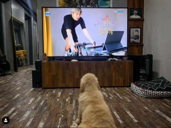 사진에는 박은석의 골든 레드 리트리버 품종 강아지 몰리의 뒷모습이 담겼다. 생후 3개월의 강아지 몰리는 '나 혼자 산다' 재방송을 집중해서 보는 듯한 모습이다.