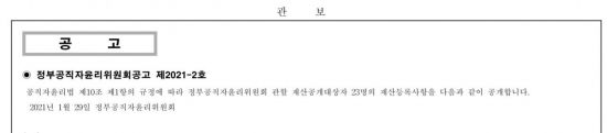 29일 정부공직자윤리위원회에 따르면 이날 0시를 기준으로 대한민국 전자관보를 통해 고위 공직자 23명의 재산이 공개됐다. 올해 들어 첫번째 재산 공개이다. 공개 대상은 신규 고위 공직자 7명, 승진 공직자 5명, 퇴직 공직자 9명 등 모두 23명이다.