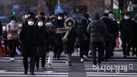 서울 전역에 강풍주의보가 발효된 28일 서울 광화문 인근 거리에서 시민들이 발걸음을 옮기고 있다. 기상청은 금요일인 29일까지 전국 대부분 지역에서 순간적으로 바람이 70km/h(20m/s) 이상, 특히 인천·경기서해안과 도서지역에는 90km/h(25m/s) 이상 매우 강하게 불겠다고 예보했다./김현민 기자 kimhyun81@