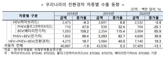 한국무역협회 국제무역통상연구원이 31일 발표한 '신성장 산업의 선두주자, 전기차의 수출동향과 시사점' 자료에 따르면 지난해 한국의 친환경차 수출은 71억4000만달러로 전년대비 19.3% 증가한 것으로 나타났다. 이는 배터리전기차, 플러그인 하이브리드차, 하이브리드차 등을 모두 포함한 것이다. 전체 자동차 수출 중 친환경차가 차지하는 비중은 19.1%로 2017년 8.6% 이후 꾸준히 늘고 있다.