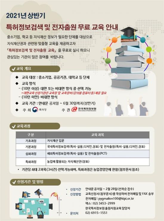 교육내용은 특허·실용신안·상표·디자인 순으로 연간 교육과정을 수립해 전자출원과 정보검색의 기초교육 중심으로 채워진다. 진행방식은 화상회의 플랫폼을 이용한 온라인 교육으로 50명 이내로 선착순 접수한다. 신청 기간은 이달 2일~내달 19일이다.